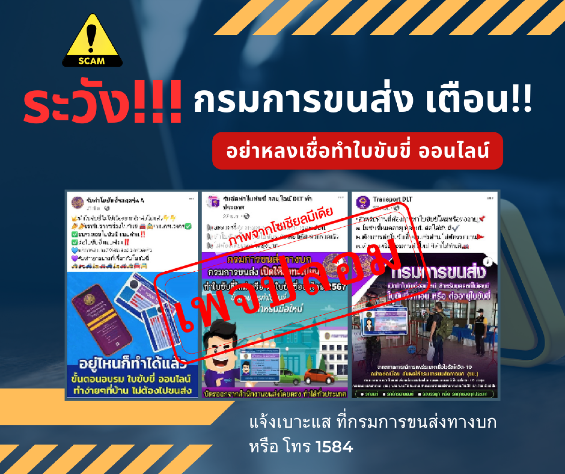 กรมการขนส่งทางบก ออกเตือนอย่าหลงเชื่อทำใบอนุญาตขับรถปลอมผ่านทางออนไลน์ และอย่าโอนเงินโดยเด็ดขาด แนะนำให้ดำเนินการผ่านช่องทางกรมการขนส่งทางบกดีกว่า